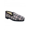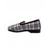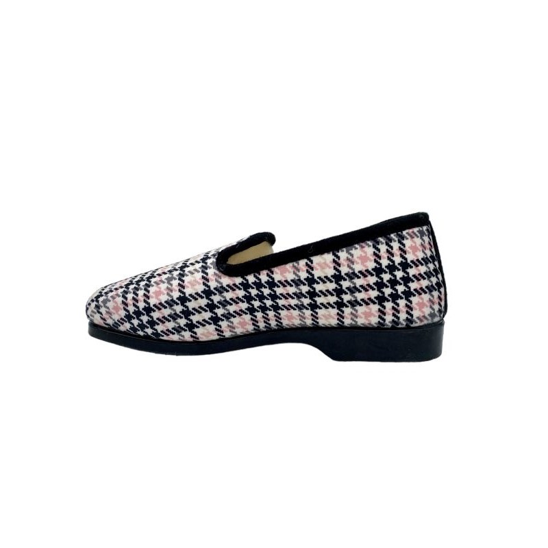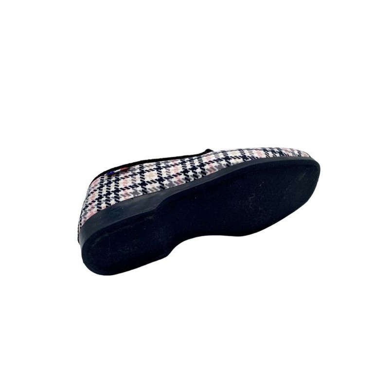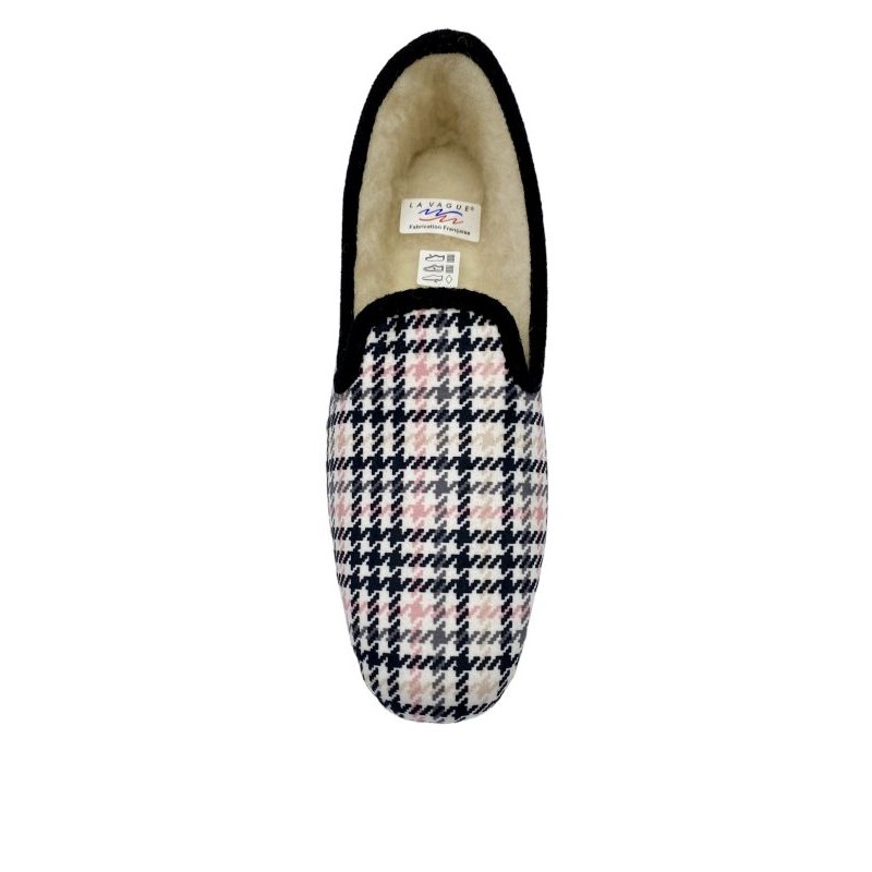 Chausson fourré en laine à l'intérieur pour tenir chaud aux pieds avec des motifs quadrillés noirs, blancs, gris et roses. La semelle est en élastomère. Disponible en grande taille femme en pointure 42, 43, 44 et 45