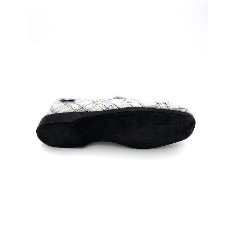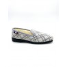 Chausson gris en laine peignée à carreaux, avec son intérieur fourré mouton véritable de fabrication française par la marque La Vague avec sa semelle en élastomère très résistante. Disponible en grande pointure femme en taille 42, 43, et 44.