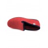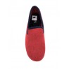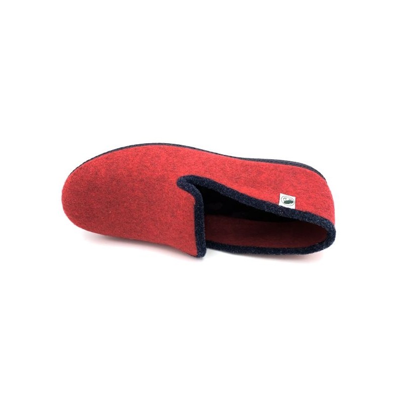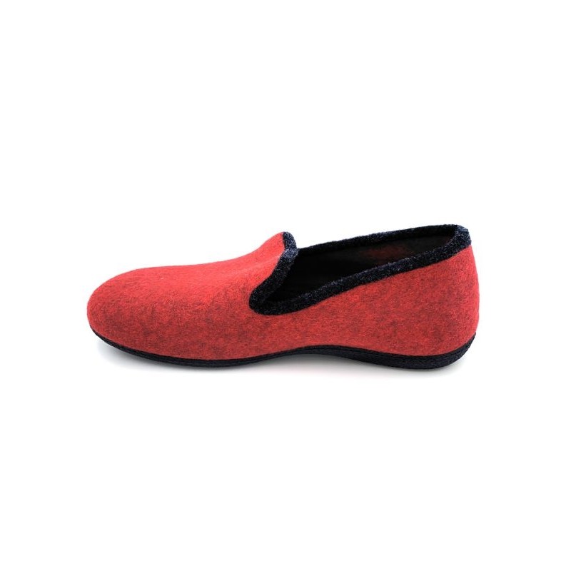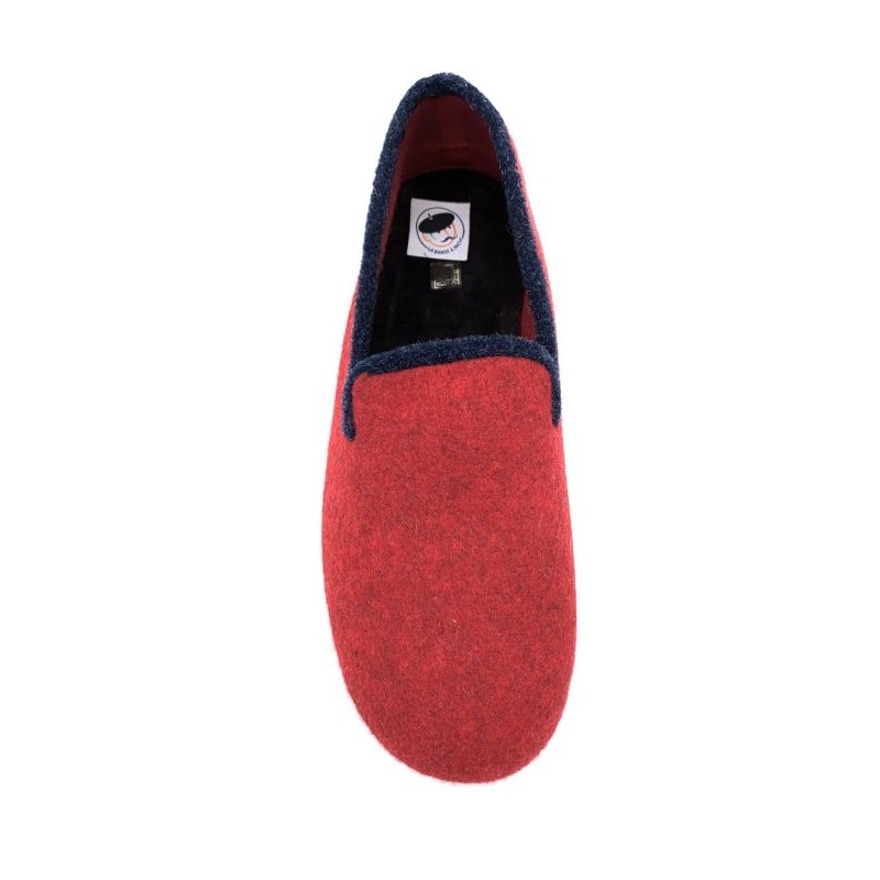chausson rouge en laine, élégant avec son liseret noir avec une semelle en gomme, idéal pour marcher chez soi en étant à l'aise. Disponible en grande pointure homme en taille 47, 48, 49 et 50.