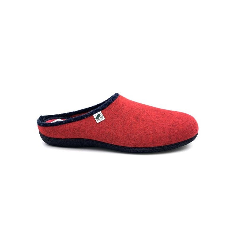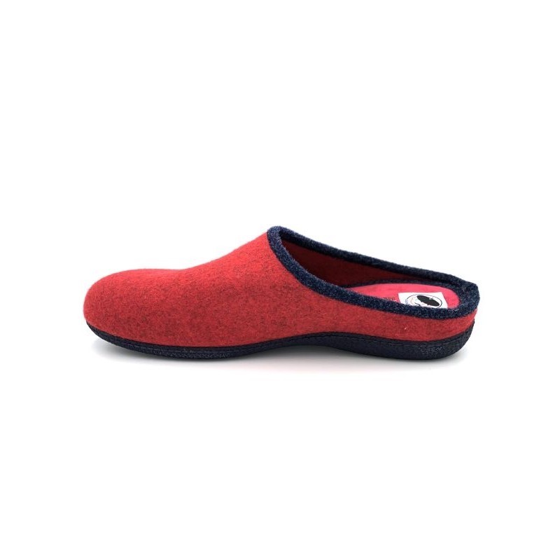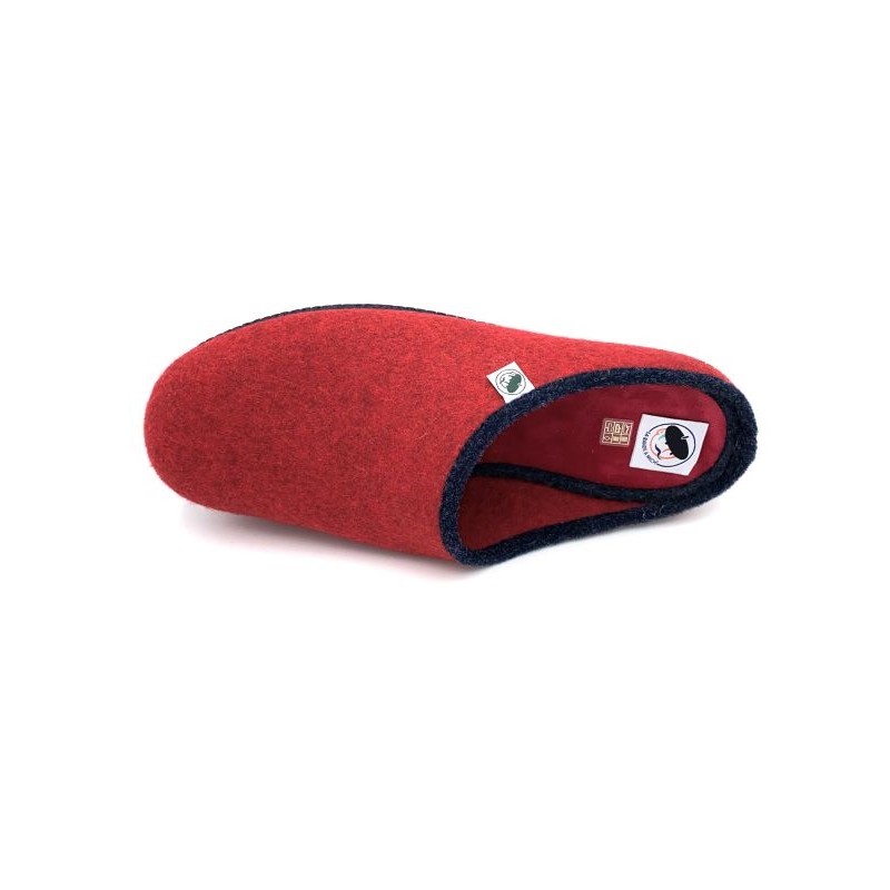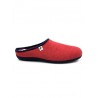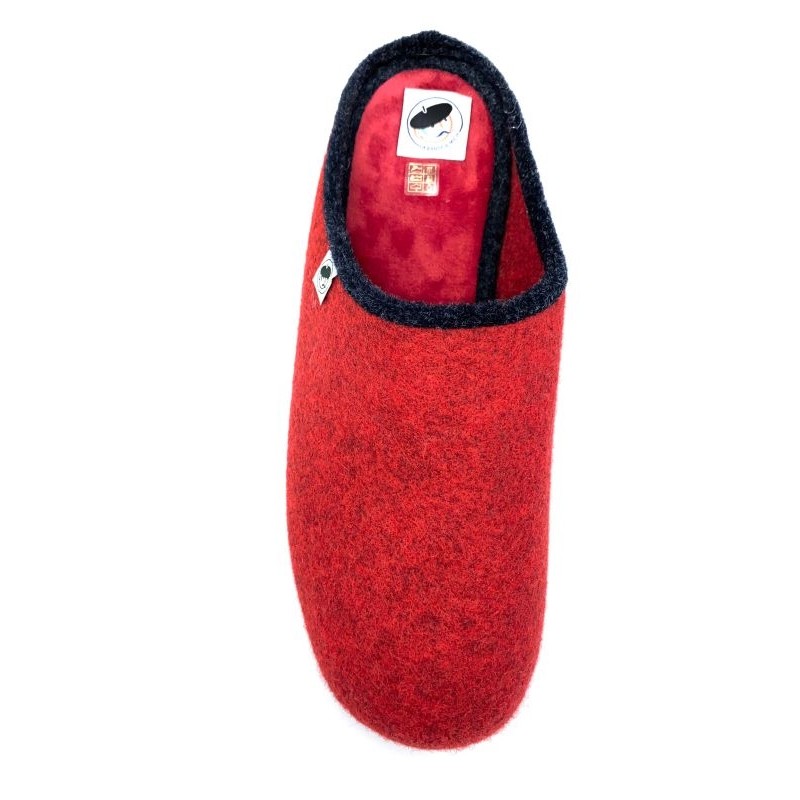Mule rouge en laine, avec son petit liseret noir, bien emboitante et confortable de la marque française La Bande à Mich. Disponible en grande taille homme en pointure 47, 48 et 49.